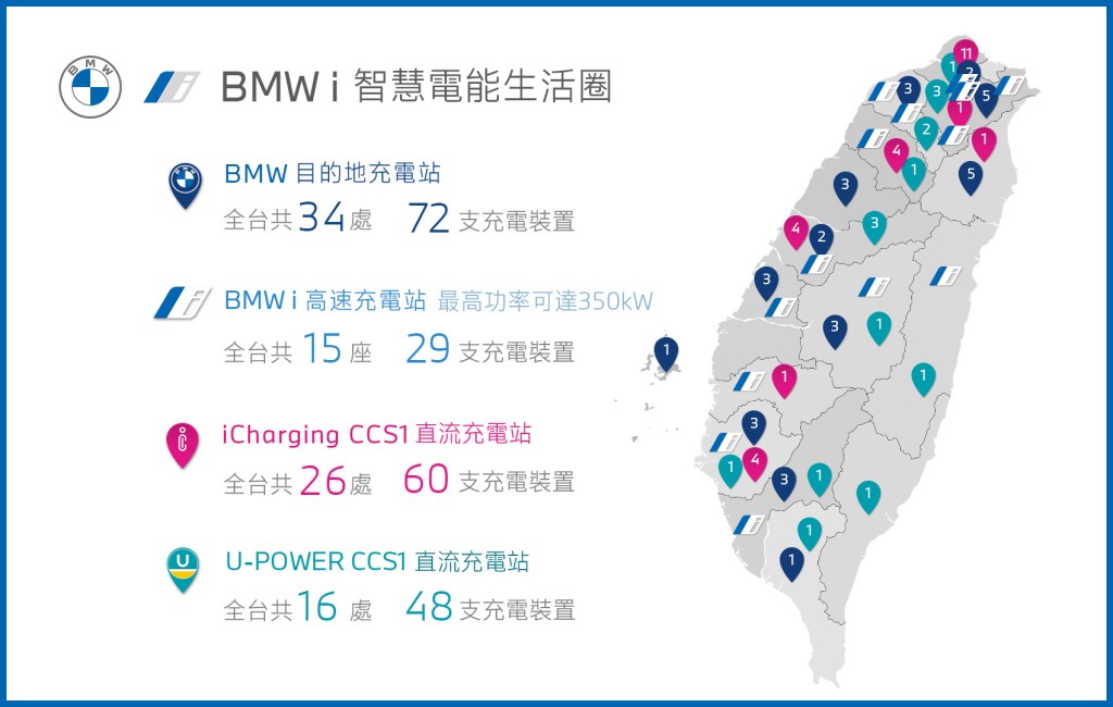 BMW總代理汎德不僅持續擘畫台灣超高速充電網絡,更偕同經銷商夥伴於台北101、晶華酒店、台北大直NOKE忠泰樂生活、南投日月潭涵碧樓酒店、台南安平雅樂軒酒店及高雄義大皇家酒店等全台豪華度假飯店、大型百貨購物商圈人群聚集重點區域,規劃建置超過100座BMW目的地充電站,再加上全台將近4,000座的公共充電站點,BMW以台灣市場豪華品牌電動車領導者之姿,為BMW電動車主打造出業界最快充電速度、最舒適的充電環境與最便利完整的充電站點,建構出超越對手的BMW i智慧電能生活圈,以更全面且完備的環台純電佈局,展現BMW領航台灣豪華品牌純電市場的決心與強勁實力。