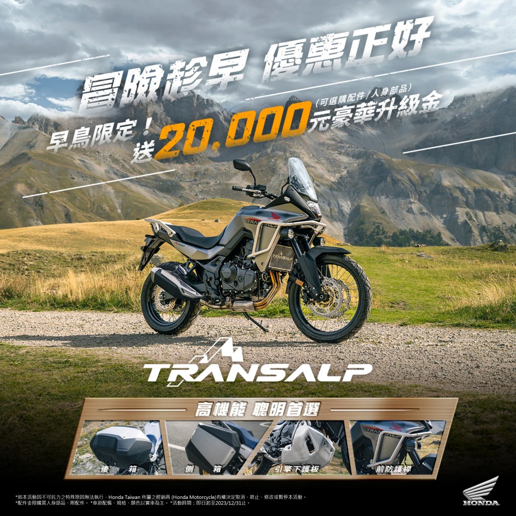 全新2023年式XL750 Transalp於即日起開始預接訂單正式售價為468,000元,車色分別為 : 經典三色白、消光金屬黑,預計於2023年底到港,為了感謝所有喜愛Honda Motorcycle的顧客,針對全新2023年式XL750 Transalp推出早鳥限定優惠,在12月31日前訂車,即贈2萬豪華升級金(可選購配件/人身部品),為探索未知的旅途增添獨一無二的裝備。
