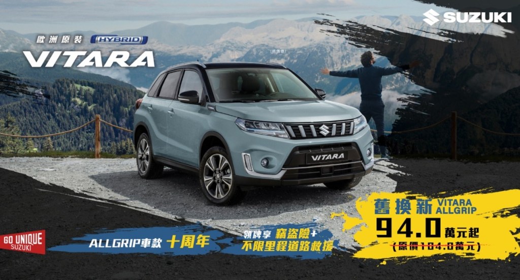 歡慶ALLGRIP車款上市10週年,以SUZUKI車款舊換新購買VITARA S ALLGRIP、S-CROSS S ALLGRIP車款除政府舊換新補助外,再享$50,000元優惠專案,非SUZUKI車款舊換新購買VITARA S ALLGRIP、S-CROSS S ALLGRIP車款除政府舊換新補助外,可享$30,000元優惠折扣,再享竊盜險+不限里程道路救援。
