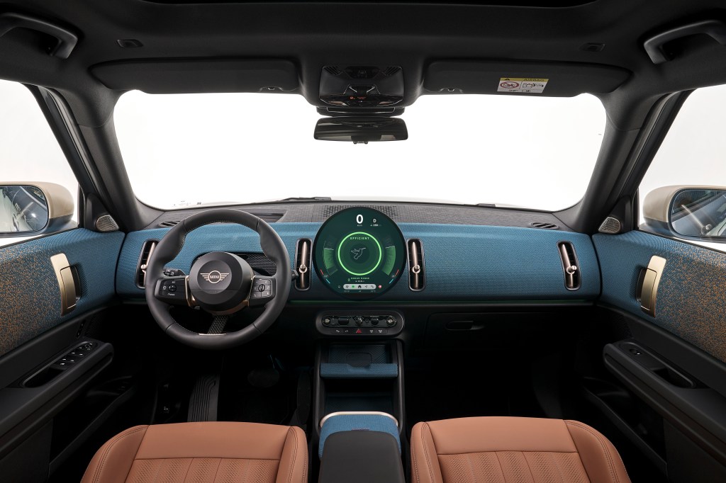 內裝另一大亮點為材質選用理念:如同外觀設計理念,內裝亦大幅度降低使用生產過程中會產生污染的鍍鉻元素;儀表台與門板表面首次應用織物質地,選用以大量回收材質製成的再生聚脂纖維雙色織布,紋理交織清晰的面料散發時髦感,亦帶來溫暖的車內氛圍。而真皮座椅材質自新世代MINI Countryman開始即停止供應,取而代之的是全素Vecsin合成皮,除了更加耐用的特性之外,細緻的表面亦可呈現如同以往的精品質感。新世代MINI Countryman透過材質運用,清楚地宣示了品牌在環保永續理念的實踐。