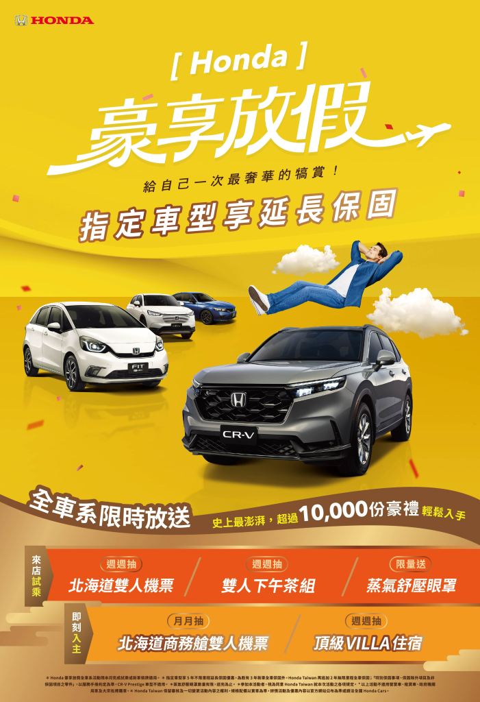 為讓更多喜愛Honda的消費者輕鬆實現嶄新的移動喜悅,並讓Honda陪伴您每段假期的璀璨時光,Honda Taiwan本月推出豪享放假專案,全車系來店試乘週週抽「北海道雙人機票」、「雙人下午茶組」,限量送「蒸氣舒壓眼罩」好禮。本月全車系入主再加碼月月抽「北海道商務艙雙人機票」、週週抽「頂級VILLA住宿」等超過10,000份贈禮,讓您擁有史上最豪奢的優惠禮遇!