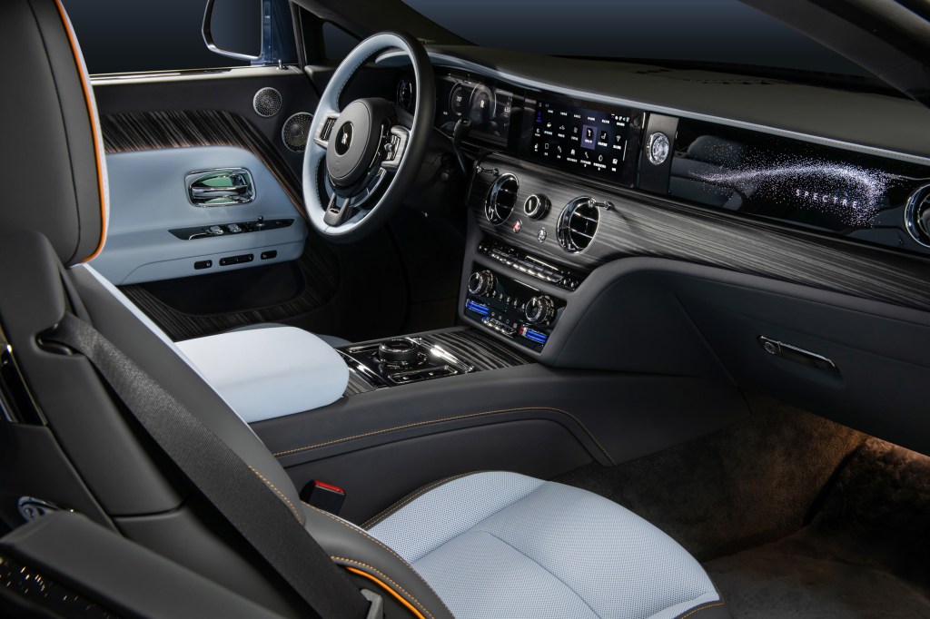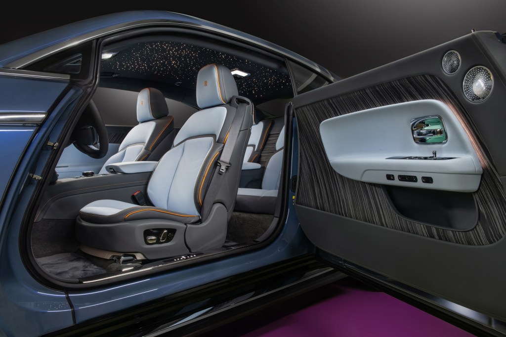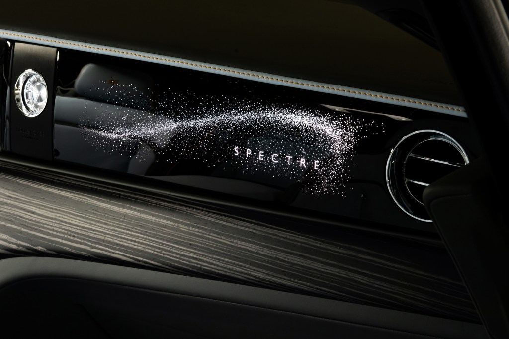Spectre 的內飾設計靈感源於雋永神秘的夜空,也是勞斯萊斯首款配備星光車門(Starlight Doors)的量產車型。該設計以4,796 顆柔和光點營造出璀璨星空。其車門可定製 Canadel 木質鑲板作為背板,Canadel 木質鑲板的命名源於法國南部的海灣,這裡曾是亨利·萊斯爵士 (Sir Henry Royce) 和設計團隊的冬季工作地點。