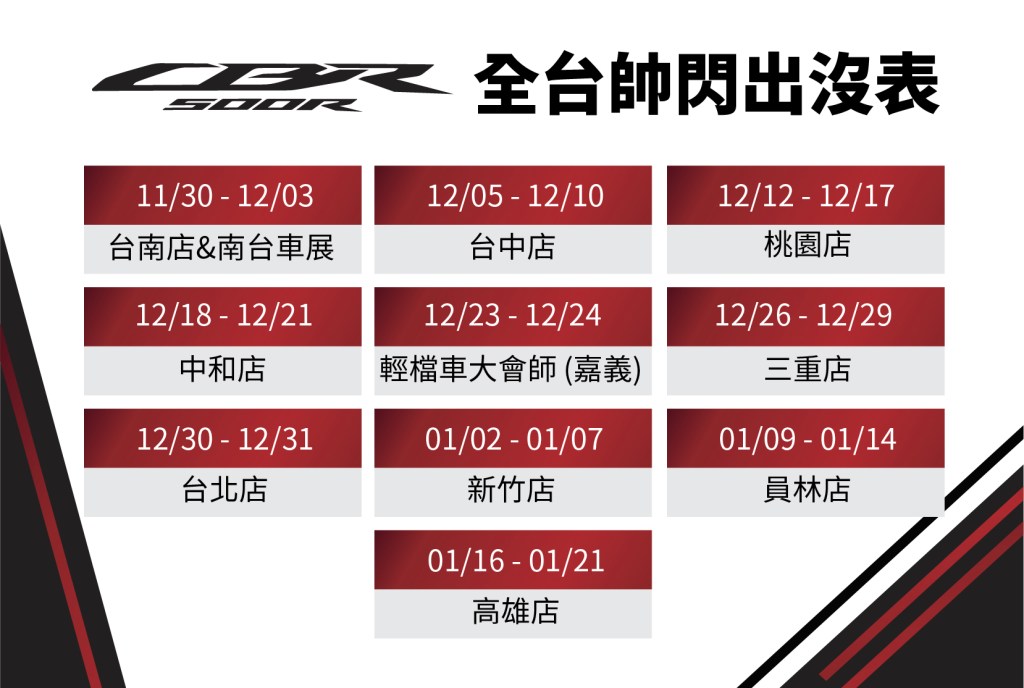 全新2024年式CBR500R於即日起開始預接訂單正式售價為29.9萬元,車色分別為 : GP紅、消光黑,預計於2024年第一季到港,於2023年12月2號、3號南臺科大汽機車大展首次亮相,隨後展開全台巡迴展示活動,2月底前完成訂車,還有機會獲得限量賽道體驗券。