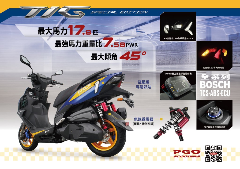 TIG 征服版限量發售加量不加價。除了外觀上增加征服版飾貼外,另外將精品作為標配「預載可調伸側可調的氮氣掛瓶避震器」,騎士可依需求進行個人化的調整,提升車輛的操控性與騎乘樂趣。TIG 征服版 99 台,限量接單,售完為止,即刻行動吧!