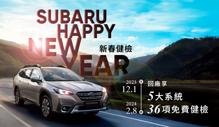 年末將至,即將迎來元旦連假與農曆春節的出遊返鄉高峰時刻,SUBARU為確保每位車主的愛車車況都能以最佳狀態駛向嶄新的2024年,同時駕駛愛車與全家人安心無虞地享受每一趟愉悅旅程,即日起隆重推出「2024 SUBARU新春健檢」活動,自2023年12月1日起至2024年2月8日止全面起跑,凡於活動期間預約返廠,貼心提供全車五大系統36項免費健檢,更享有專屬車體美容限時優惠及原廠零配件優惠回饋禮遇,回廠單筆消費滿額再贈原廠精緻好禮,敬邀全台SUBARU車主於歲末年終之際提前預約回廠,讓SUBARU最專業的服務團隊悉心照護您的愛車。