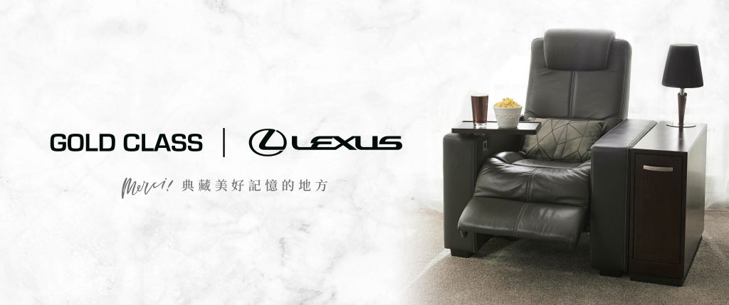 Lexus今年12月起與台中、台南、高雄3個GOLD CLASS影廳聯名合作推出頂級觀影體驗,影廳內提供可調式皮革座椅,能恣意調整觀影角度,更備有服務鈴、置物櫃、可調式桌面、抱枕、毛毯、充電設備等,盡享寬敞舒適的觀影時光。此外,影廳提供精緻餐點供民眾品嘗經典佳餚,可於等候電影時於別緻的休憩大廳用餐,亦可於觀影時享用美食,體驗賓至如歸的愜意時光。