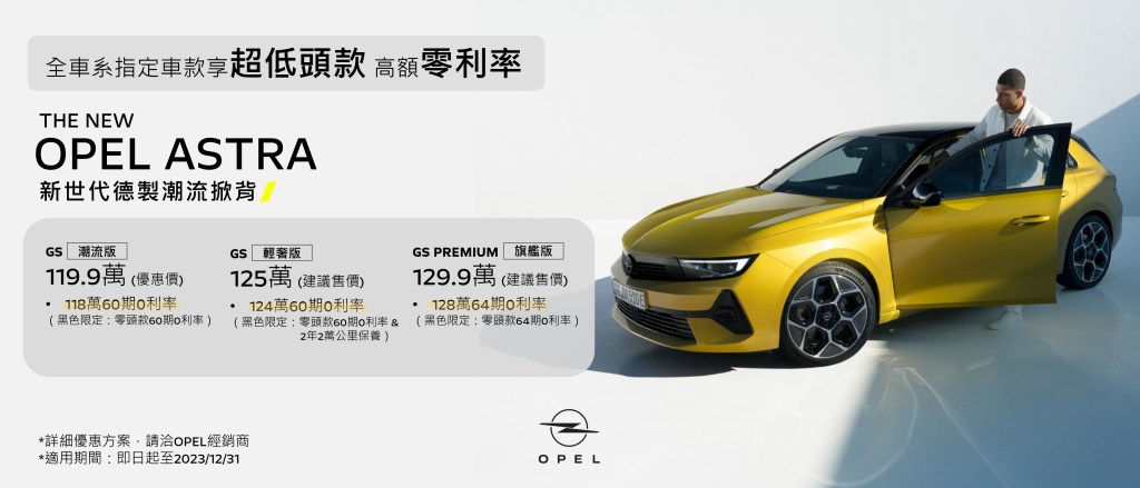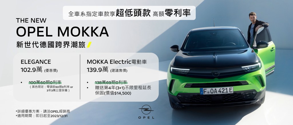 隨著2023年進入尾聲,為回饋喜愛OPEL的車迷朋友們,OPEL台灣總代理 歐吉汽車特別推出年終感恩優惠價,即日起至2023年12月31日止,全車系享超低頭期款、高額0利率;限定車色之指定車款最高可享零頭款、高額0利率及免費保養。敬邀喜愛OPEL的車迷朋友們親臨展示中心及品牌體驗館,感受新世代德國跨界潮旅MOKKA、純正德國SUV GRANDLAND亦或是新世代德製潮流掀背ASTRA的獨特魅力。