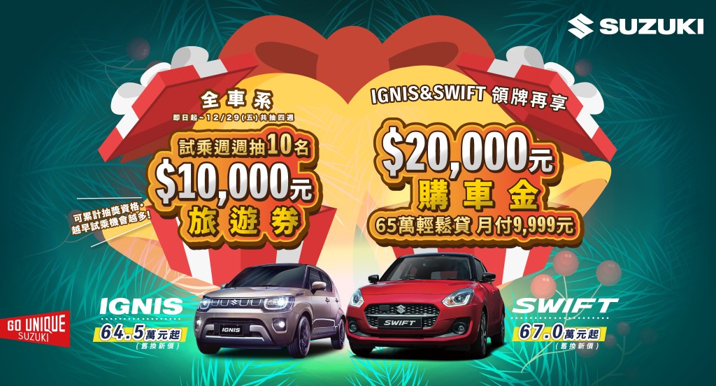 2023年即將進入尾聲,為了回饋廣大車迷的支持愛護,TAIWAN SUZUKI於12月推出『全車系試乘週週抽$10,000旅遊券』活動,即日起至12/29(五)每週五將抽出10名幸運兒,共將抽出40名幸運兒!試乘登錄後每週皆具抽獎資格,越早前來試乘者抽獎次數越多,立即搶先完成試乘者抽獎次數越多,快揪大家一起賞車試乘試手氣!