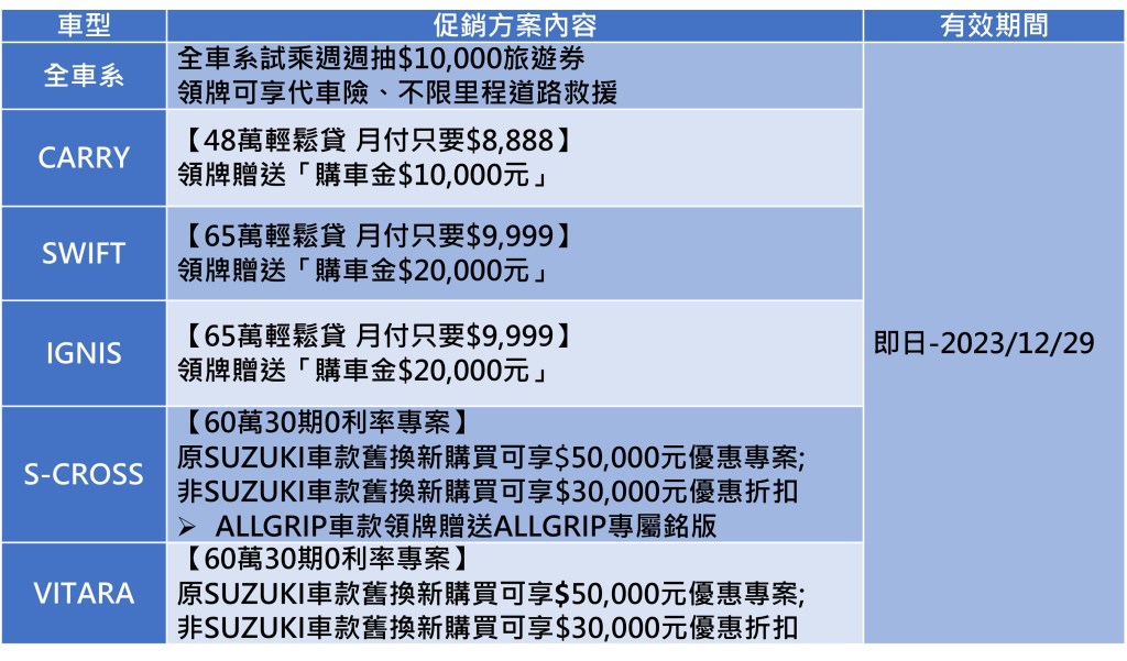 1. 全車系試乘週週抽活動專案為2023/12/01起至2023/12/29 16:00前需到店試乘並需填寫完整客戶資料才可獲得抽獎資格,抽獎日期為2023/12/08、15、22、29共四週,得獎資訊請見TAIWAN SUZUKI官網。