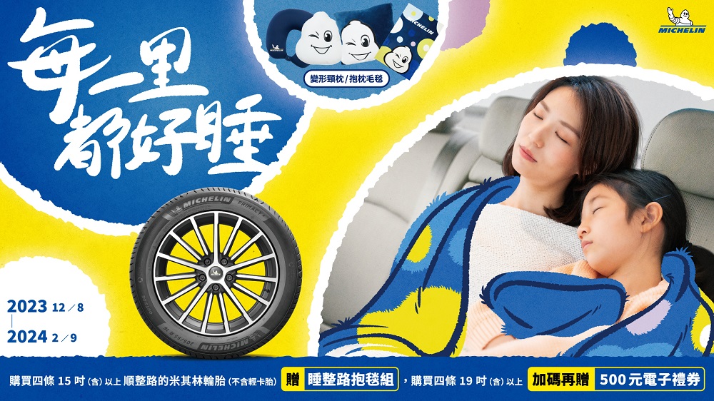 米其林輪胎的優異性能,一向是愛車人士的換胎首選,因「創新」技術帶來卓越品質,更使米其林成為全球輪胎領導品牌。看準年節假期的出遊趨勢,米其林搶先在年終歲末推出「每一里都好睡」超好康優惠,即日起至2024年2月9日,凡至台灣米其林輪胎官方網站公告之銷售店點,購買四條15吋(含)以上米其林輪胎,即贈「睡整路抱毯組」,購買四條19吋(含)以上米其林輪胎,加碼再送500元電子禮券,期望以米其林輪胎寧靜、舒適的行駛特性,助力車主新年開車順整路,更讓乘車親友「每一里都好睡」,提供駕駛一個專注駕車的行駛時光。