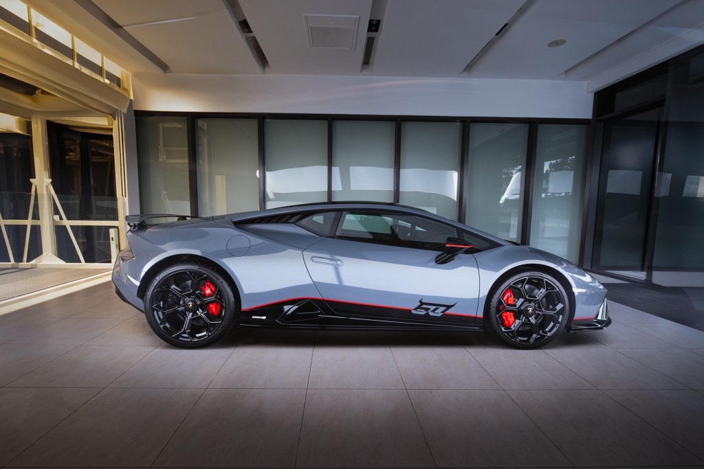 同場亮相的60周年紀念版Huracán Tecnica 為全球限量生產配額之1/60,外觀車色以Grigio Telesto珍珠灰搭配黑色與紅色的烤漆線條,以及車身下緣的60周年logo,型塑濃厚競技風格。位於碳纖維跑車座椅上的「60」刺繡以及限量專屬銘牌在在顯現此車款與眾不凡的紀念身分。