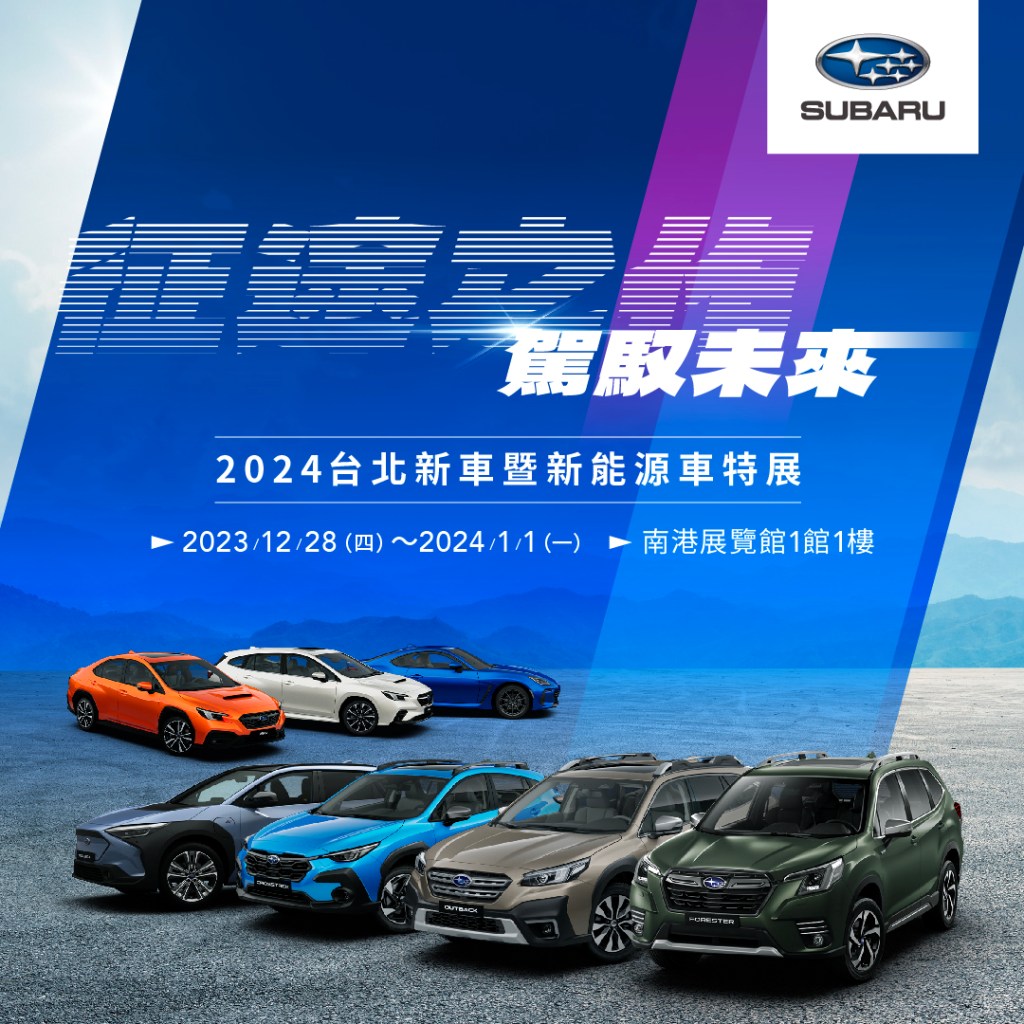 SUBARU誠摯地邀請各位朋友們蒞臨「2024台北新車暨新能源車特展」,並於12月28日至1月1日展覽期間,造訪南港展覽館1館一樓SUBARU「征途之作,駕馭未來」展演區,近距離鑒賞追求極致安全與性能的SUBARU新世代車款。更多活動訊息及SUBARU全車系車款資訊,可瀏覽查詢SUBARU台灣官方網站 http://www.subaru.asia/tw/zh/home/,或撥打SUBARU客戶服務專線0800-486-168,洽詢車展資訊相關內容,也歡迎所有朋友們即刻動身,前往離你最近的SUBARU展示間賞車並預約試駕體驗,展示間位置與詳情請參閱SUBARU台灣官方網站https://www.subaru.asia/tw/zh/how-to-buy/showroom-locations/。