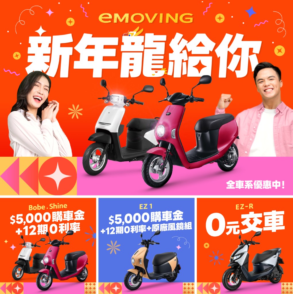 eMOVING各車款同慶新年也推出超值優惠,微型電動車SHINE、Bobe及綠牌輕型EZ1同享購車金5,000元,EZ1再加贈原廠品牌風鏡組;EZ-R則推出「0元交車」方案日付只要98元,簡單入主旗艦白牌電動機車。過年前為自己選一台車,好康優惠千萬不要錯過,歡迎親臨門市,親身體驗eMOVING系列車款的非凡之處。為民眾生活更多提供可能性,為生活加電!