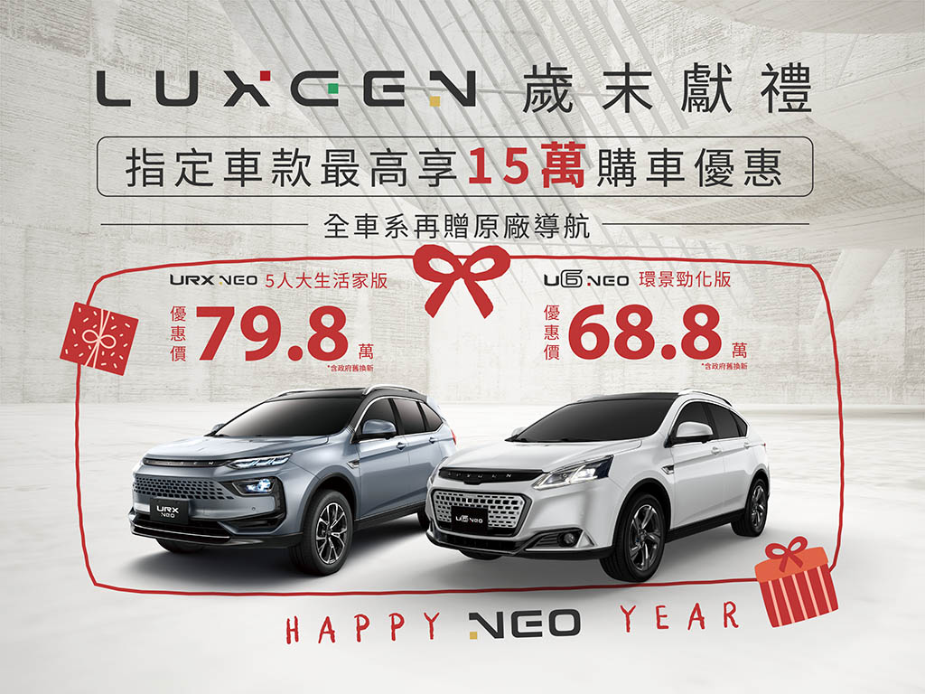 LUXGEN為讓您迎向嶄新一年的同時,皆能輕鬆買車過好年,活動期間入主LUXGEN指定車型可享「歲末獻禮專案」(1),其包含:獨具跑格的「U6 NEO 環景勁化版」,讓消費者以不到70萬的入門小型休旅價格,同時擁有舒適大空間、充沛大馬力,以及最完善的主被動安全科技配備,全面滿足憧憬跑格休旅買家的駕馭樂趣與智慧用車生活,現正入主可享超低優惠舊換新68.8萬元(原售價83.8萬)(3);多元用途的「URX NEO 5人大生活家版」,不僅符合現代人的日常使用習慣,同時滿足家庭生活、戶外休閒等用車需求,提供高顏質、高馬力、高科技、大空間,全方位打造舒適與科技兼備的智能座艙,現正入主同步享舊換新79.8萬元(原售價94.8萬),讓您能以不到90萬的超值優惠,皆能成為多采多姿的大生活家。