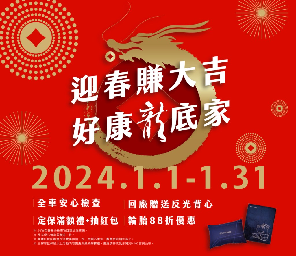 為祝福車主在新的一年龍總發大財,活動期間回廠即贈送迎春賀禮『HINO龍年紅包春聯組』。此外,定保消費滿9,000元,並下載「Hi HINO APP*註3」綁定車輛,即可獲得限量『HINO兩用抱枕毯』,並抽『開運紅包』一個*註4,最大獎為『10萬元購車金』*註5共3名,邀請所有頭家車主一起回廠試手氣,財運龍總來!