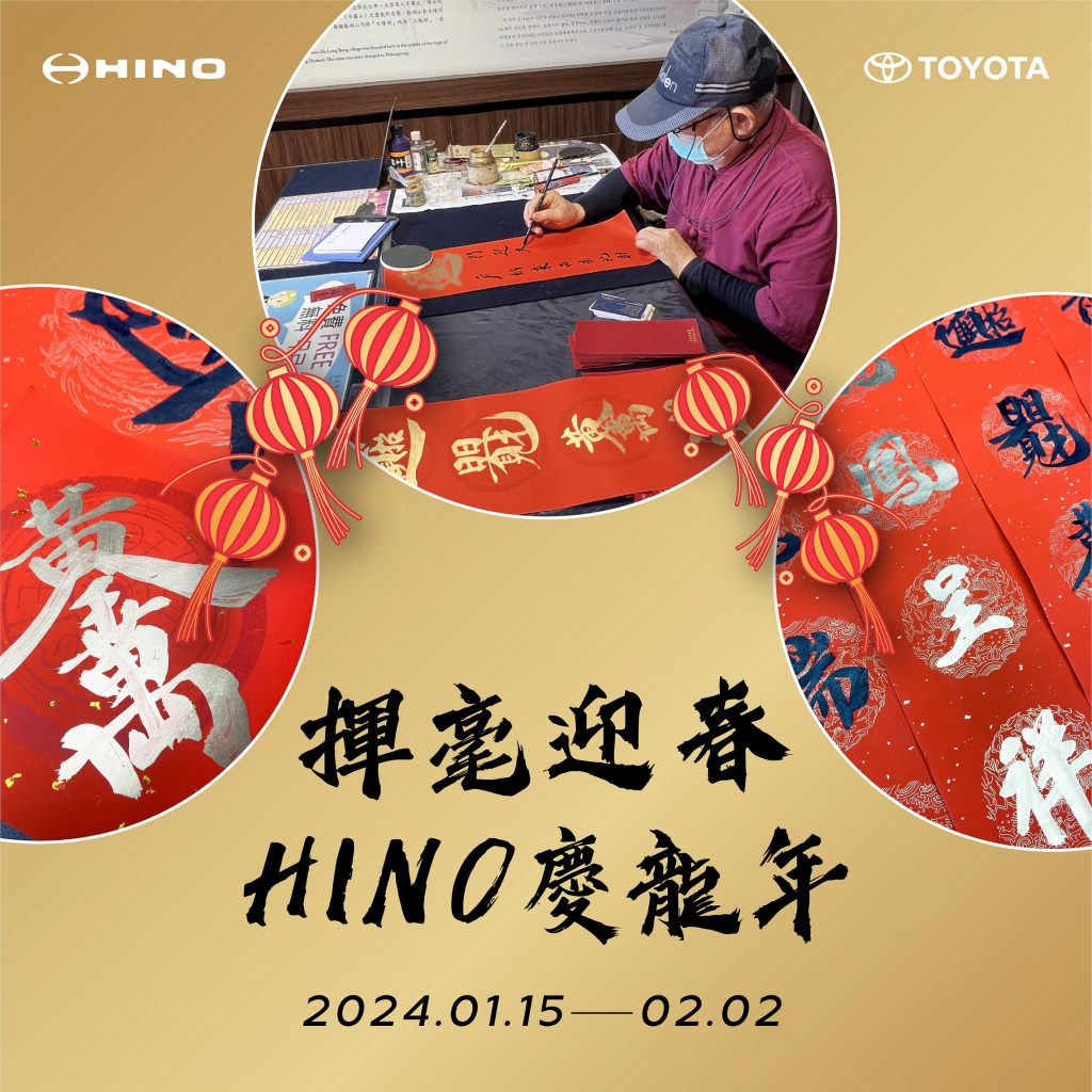 此外,為增添年節喜氣氛圍並宏揚書法之美,1月份各服務廠同步舉辦「龍年新春揮毫快閃活動」,邀請當代書法名家老師現場揮毫贈春聯,除了準備商用車實用吉祥話春聯與賀年組合字供車主選用,更提供『客製化揮毫服務』,依顧客行業特色,書寫客製化春聯贈送顧客,祝福所有車主生意興龍、好運連年! 新春揮毫各服務廠活動時間詳見下表,各項活動訊息,請洽詢服務廠或至HINO官網、LINE@官方帳號、Hi HINO APP查詢。