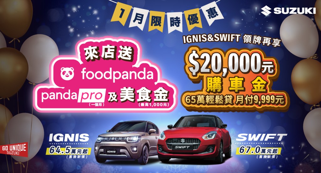 5. SWIFT(不含SWIFT Sport車款)、IGNIS最高20,000元購車金為購車後抵用,上限為$20,000元,購車金限當車當次購買抵用,實際交易價格由買賣雙方各自依交易條件議定之,詳情請洽各大經銷商。本活動不適用租賃、營業、政府機關及專案批/標購之車輛。