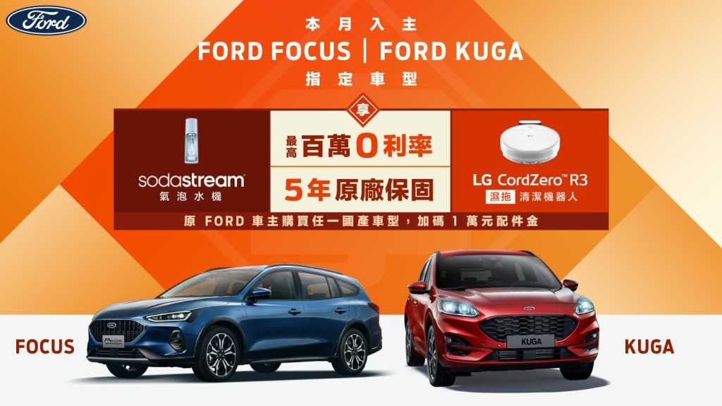 | New Ford Kuga | 2023年12月30日至2024年1月31日止 入主EcoBoost®180車型享最高100萬0利率、5年原廠保固(3年原廠保固+2年加值型延長保固)再贈「LG CordZero™R3 濕拖清潔機器人」。 入主EcoBoost®250 AWD車型享最高100萬0利率、5年原廠保固(3年原廠保固+2年加值型延長保固)再贈「LG CordZero™R3 濕拖清潔機器人」及「SodaStream TERRA 快扣機型氣泡水機」。 原Ford車主換購全車系可享1萬元配件金。 |