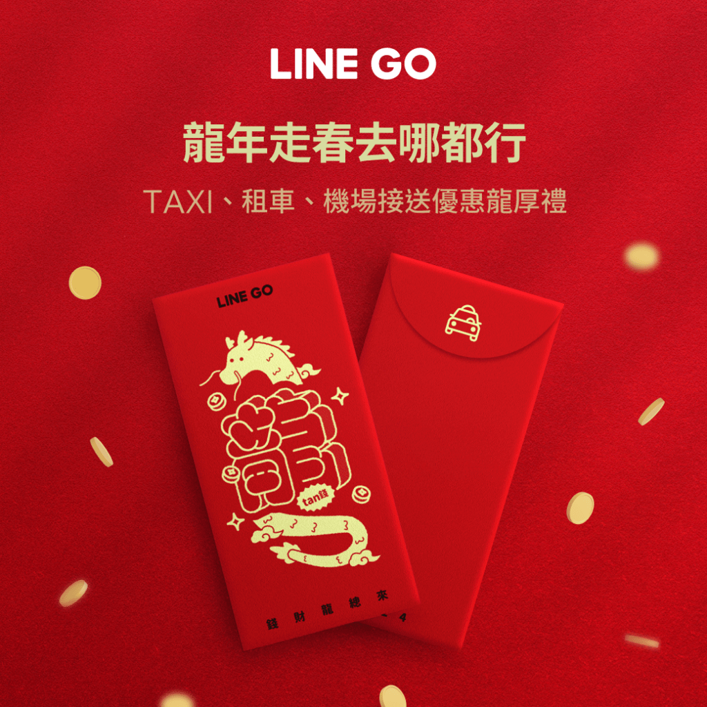 LINE GO平台即日起至二月底前,提供包括LINE TAXI 多元計程車、星選科技車,輸碼領折扣至多每趟50元優惠活動,機場接送最高折扣200元;即刻開通LINE GO租車會員,審核通過,將享有首次使用自遊租共享車服務30分鐘免費;春節期間搭車、租車還有機會拿到LINE GO龍年限量轉運春聯或紅包袋。