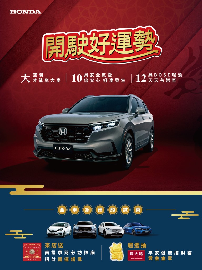 為感謝消費者長久以來的支持,Honda Taiwan即日起至2月29日止,限時推出開駛好運勢活動,全車系來店試乘送南投求財聖地神廟「招財開運錢母」,再週週抽「周大福平安健康招財貓黃金金章」開運好禮,讓您新春好運不斷。歡迎消費者即刻至全國Honda Cars試駕體驗或至官網了解Honda車款的獨特魅力。