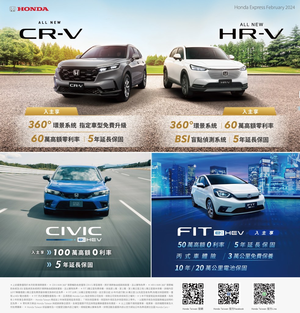 Honda Taiwan感謝消費者長久以來的支持,即日起至2月29日止,限時推出開駛好運勢活動,全車系來店試乘送南投求財聖地神廟「招財開運錢母」,再週週抽「周大福平安健康招財貓黃金金章」。本月入主CR-V享「60萬高額0利率」等好禮;入主CIVIC e:HEV享「100萬高額0利率」等好禮;入主HR-V享「60萬高額0利率」等4大豪禮;入主FIT e:HEV享「50萬高額0利率」等5大超值贈禮。Honda Taiwan敬邀廣大的消費者即刻至全台Honda Cars展示中心鑑賞或至官網線上預約試乘: https://www.honda-taiwan.com.tw/Auto/TestDrive,即刻輕鬆坐擁質感移動生活。