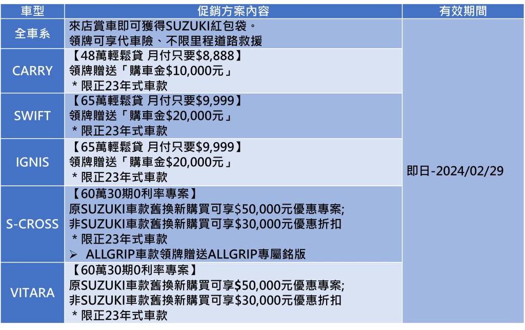 為迎接福氣滿盈的農曆春節,TAIWAN SUZUKI誠心為您送上新年好運旺旺來,來店賞車試乘即有機會獲得精美限量「SUZUKI紅包袋」。同時全車系領牌可享不限里程的道路救援及代車險,為您提供全方位的貼心保障。