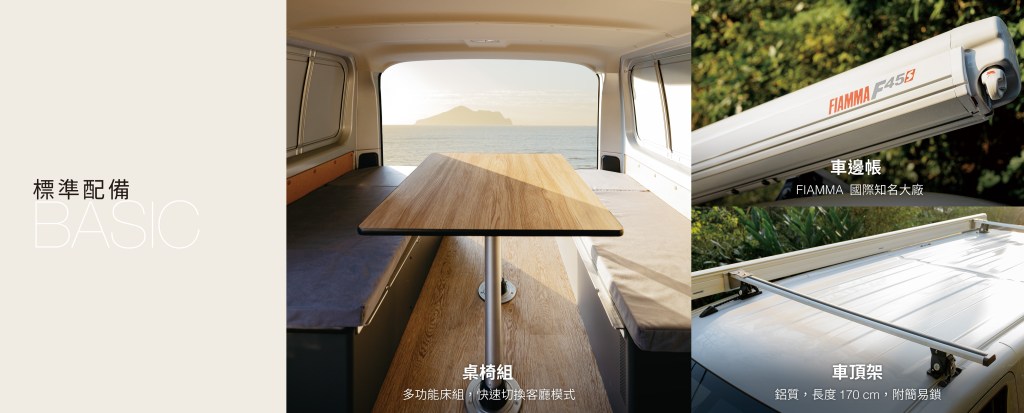 全新HIACE露營車提供了一系列豐富露營配備,全車配置都符合法規認證,從「標準配備」中的滅火器、車邊帳、車頂架,到中央桌椅組和車尾收納抽屜,無不展現對露營生活便利性及舒適度的極致追求。