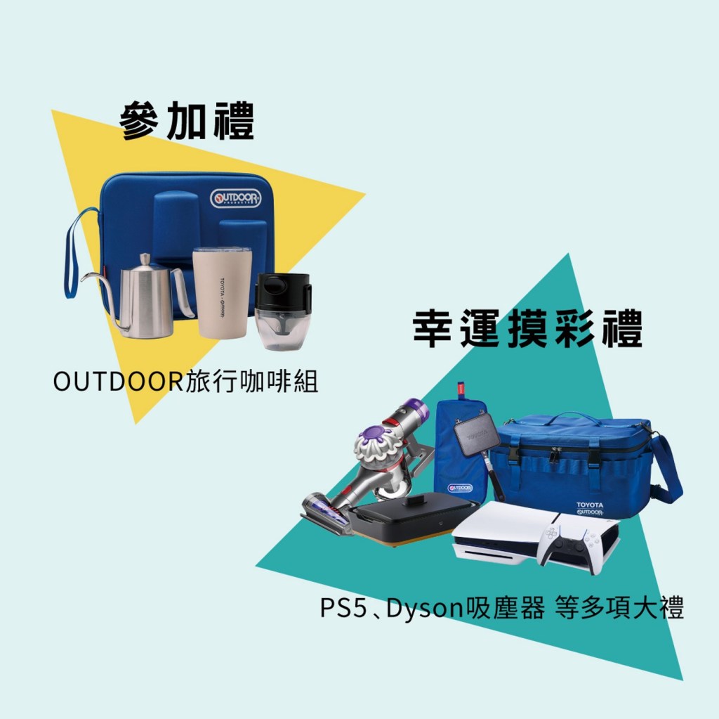本活動僅限TOYOTA HIACE / GRANVIA車主報名參加,凡完成「HIACE CAMPING 嗨咖露營趣」活動報名之車主,活動現場即可兌換OUTDOOR旅行咖啡組一份、1,000元美食攤位兌換券,以及精緻早餐等好禮。此外,現場亦提供50個以上摸彩獎項,前來參與的車主有機會把【SONY PlayStation 5】Slim 光碟版 輕薄型主機、【Dyson】V8 除塵蟎手持吸塵器及【象印】STAN美型鐵板燒烤組…等大獎帶回家!