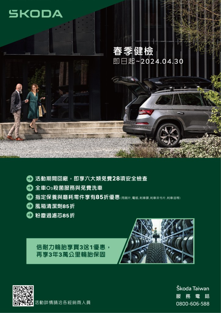 Škoda Taiwan誠摯的邀請您多多留言於FB (https://www.facebook.com/SkodaTaiwan) 粉專活動貼文並Hashtag「#Škoda 2024 春季健檢」讓我們根據您的留言持續進步來提供更完善的服務給您,欲了解更多春季健檢活動資訊,請洽全台各經銷商服務人員。