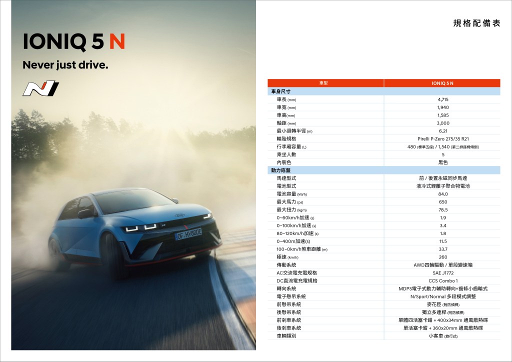 IONIQ 5 N以HYUNDAI E-GMP電動車平台為基礎,適用800V高壓電系規格,支援350kW超高功率極速充電,電池容量加大提升至84kWh,10%至80%充電18分鐘即可完成。因應高性能需球,IONIQ 5 N換裝第4代鋰離子聚合物電池,搭配N電池溫控預處理功能,讓動力系統無論在任何狀況都能維持最佳狀態,無論是短程衝刺賽或者長途耐久賽,電池組溫度維持恆穩定,給予最佳動力輸出。由N Performance部門調校650匹馬力、78.5公斤米扭力輸出的前、後雙馬達電動四驅系統,繳出0-100km/h加速3.4秒、極速260km/h性能成績。