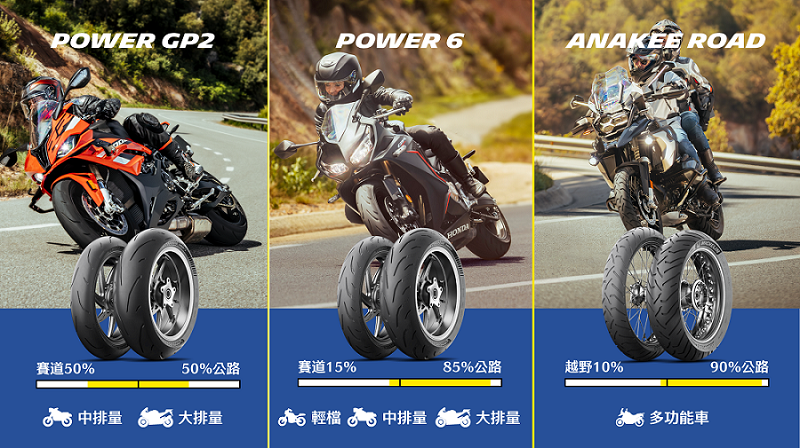 米其林 Power系列一直是街跑胎的指標產品,本次產品更新至第六代 Power 6,在乾濕地抓地力進一步增強。Power 6卓越的抓地力及操控性能,無論天候條件為何,皆能掌控自如,帶來前所未有的公路騎行樂趣。在運動性能之外, Power 6還關注里程表現,以回應日常騎行頻繁和長途行駛的需求。Power 6提供多種尺寸選擇,包含台灣目前非常熱門的300cc~400cc黃牌級距輕檔車適用的常見尺寸,並已獲得KTM、TRIUMPH等多家車廠認證。