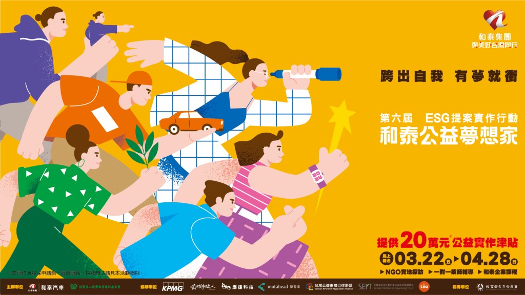 「和泰公益夢想家」邁入第六屆累積已超過800組學生團隊報名,本屆為使同學在提案過程中有更多收穫,將與7家長期耕耘永續行動的協辦單位合作,如善於輔導社會創新創業的「KPMG安侯永續發展顧問股份有限公司」、致力青年培力的「學習家有限公司」和「國際城市浪人育成協會」、長期倡議及實踐影響力投資之「台灣影響力投資協會」和「SERT社會福祉及社會企業公益信託循環基金」、台灣最大的公益團體聯盟性組織「社團法人台灣公益團體自律聯盟」與協助公益團體數位轉型的「應援科技股份有限公司」。提案過程中更安排豐富精實的培力活動,如和泰ESG永續課程、社會創新組織參訪、問題解決工作坊以及不同領域業師諮詢輔導,讓團隊在公益推行時能獲得更多資源及幫助。今年和泰公益夢想家評審包含和泰汽車永續發展委員會黃文瑞召集人、KPMG安侯永續發展顧問股份有限公司黃正忠董事總經理、青年發展署吳正煌組長、臺灣大學社會工作學系馮燕名譽教授、天下永續會熊毅晰負責人、與台灣影響力投資協會陳一強副理事長,名單橫跨產官學、品牌與媒體顧問知名代表,給予學生團隊專業務實的指導與回饋。