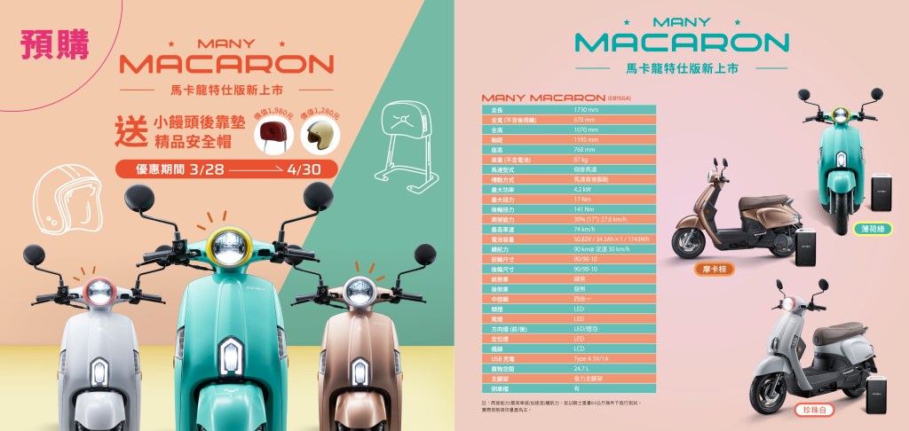 而累計銷售突破60萬台的Many,一直以來都受到廣大消費者的認同與喜愛,過去的Many EV更算是Ionex電動化的先鋒,所以配合KYMCO油電合一策略的全面推動,同步發表Many馬卡龍特仕版。Many馬卡龍是以Many EV為基礎,經過全面改造升級的時尚Ionex電動機車,擁有輕巧靈活的車身,76公分的低座墊高,可置入3/4安全帽的置物空間。搭載最新4.2kW寧靜動力馬達,與廣受好評的智能電池抽取匣,只要OneTouch一鍵按壓自動開啟,就能翻轉抽取Ionex 3.0電池。同時Many馬卡龍還具備全新進化的平面LED圓形大燈、五角盾型定位燈、一體成型後扶手,彰顯其與眾不同的氣質。而3/28-4/30只要預購Many馬卡龍,還贈送小饅頭後靠墊與精品安全帽。