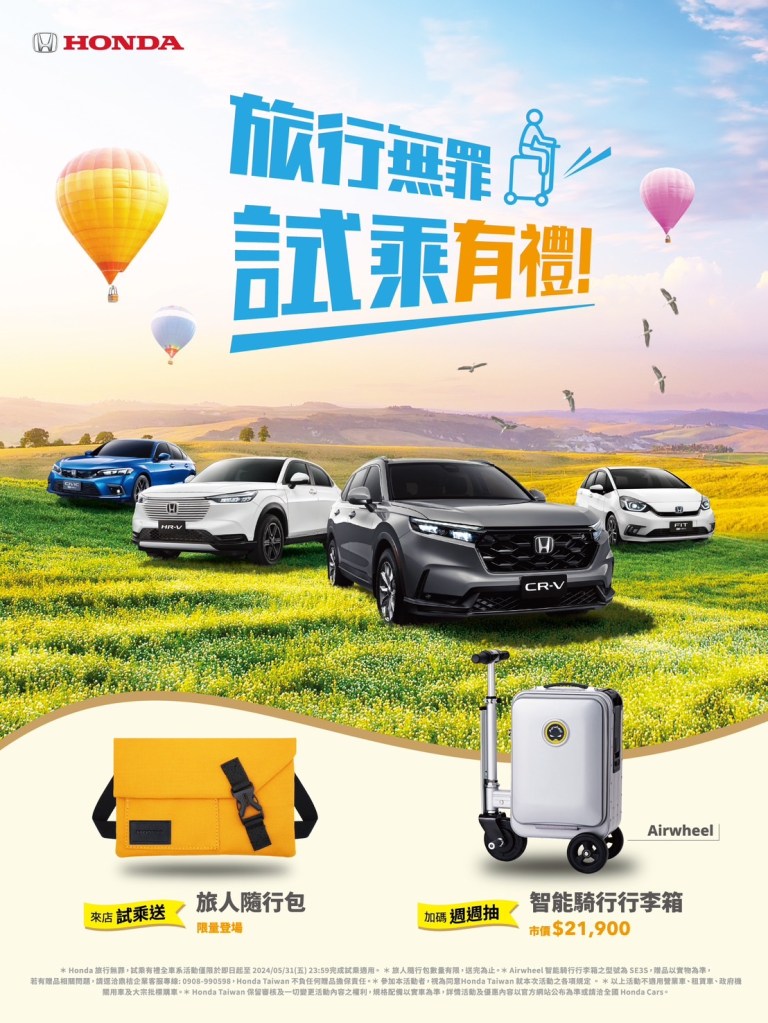 為讓喜愛Honda的消費者在春暖花開之際擁有豐富多樣的旅行體驗,Honda Taiwan本月限時推出「旅行無罪、試乘有禮」活動,全車系來店試乘送「Honda專屬旅人隨行包」,再加碼週週抽市價$21,900「Airwheel智能騎行行李箱」好禮,讓您盡享愜意生活。歡迎消費者即刻至全國Honda Cars試駕體驗或至官網 https://www.honda-taiwan.com.tw/Auto了解Honda車款的獨特魅力。