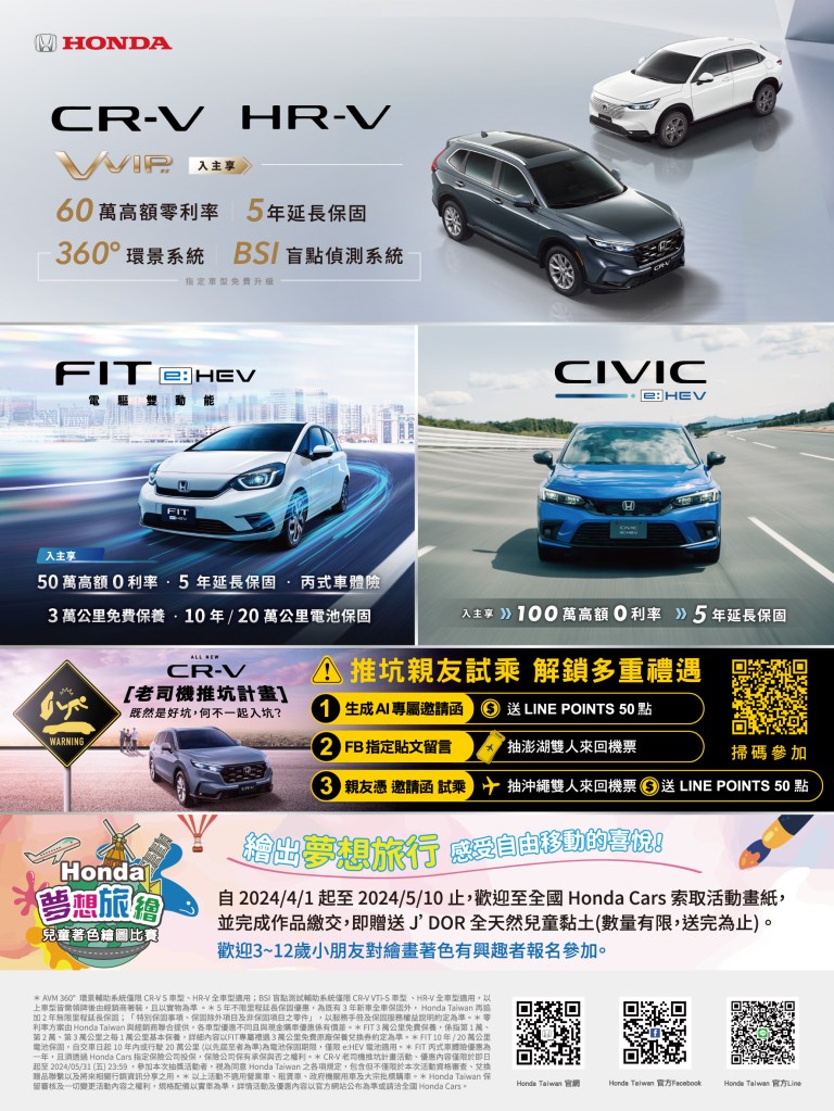 歡慶全新世代CR-V累計超過10,000台車主,即日起至5月31日止透過活動網頁製作AI專屬邀請函解鎖任務,推坑親友試乘,即可抽「沖繩雙人來回機票」等大獎。本月另加碼限時入主CR-V享「60萬高額0利率」、「5年延長保固」,指定車型再享「360°環景系統」(S適用)、「BSI盲點偵測系統」(VTi-S適用),實現滿載全家人的移動夢想喜悅。