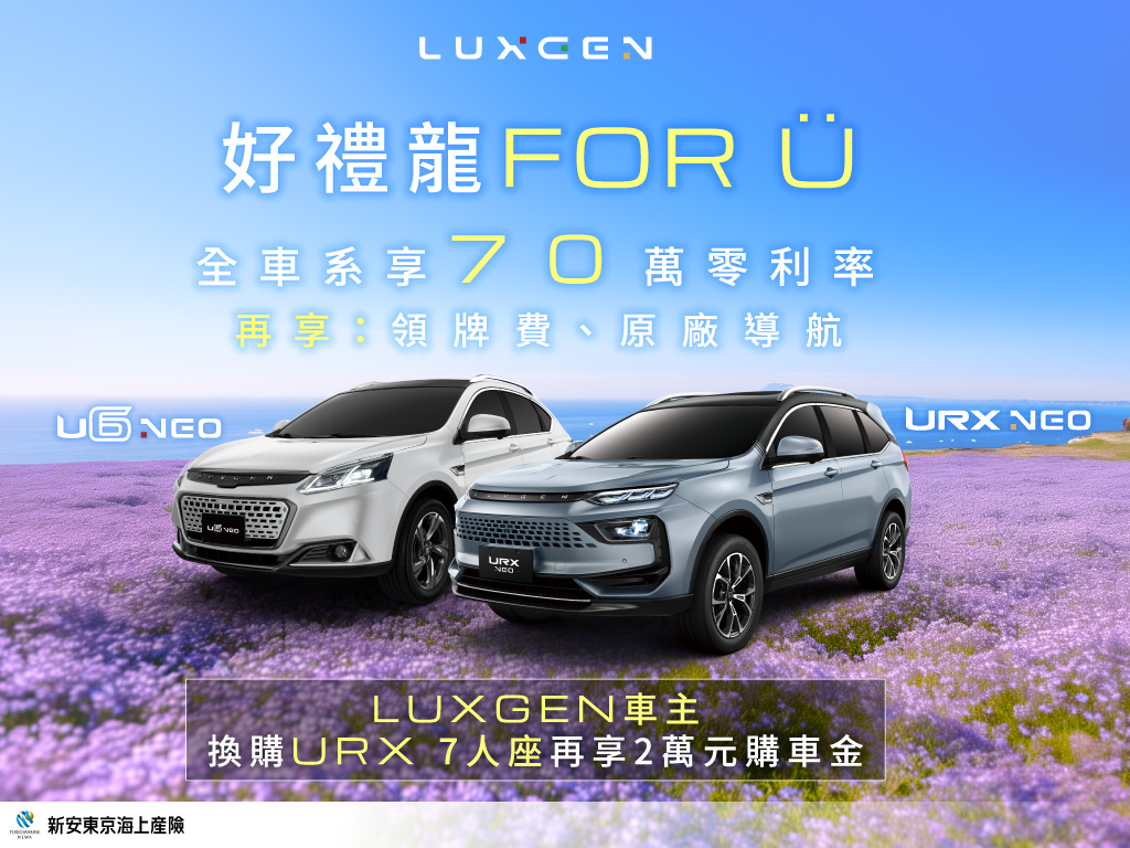 LUXGEN獻上滿滿誠意,持續抗漲讓您百萬內就能輕鬆擁有7人座SUV,以最親民的價格,夢想成真。本月入主特定車款不僅享有「好禮龍FOR U專案」外,更針對現有車主指定換購URX NEO 7人樂活版(原售價99.8萬)、7人大生活家版(原售價115.9萬),加碼回饋