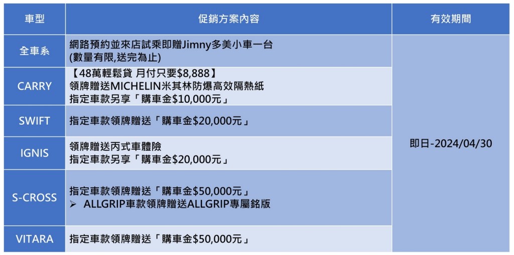 SUZUKI 一直致力於為顧客提供最優質的服務及各種充滿個性的車款,讓您探索每一個美好的角落。在春風吹拂、萬物復甦的四月,SUZUKI 為您帶來多重驚喜和限時優惠: