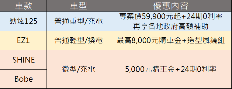 註2入手價係以購買勁炫125超質款或EZ-R CBS款,扣除(1)eMOVING提供之購車金、(2)工業局首購補助款及(3)桃園市電動車新購補助款及市民專案所計算之購車金額。此金額僅供參考,金額可能因為車款及相關補助方案有所差異,詳細內容以官網活動及各縣市公告內容為主。