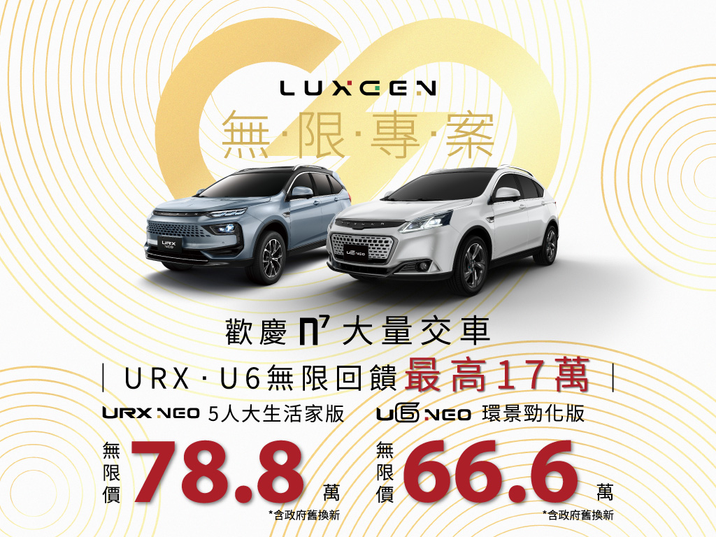 為了慶祝新世代純電休旅LUXGEN n⁷熱烈交車,並與消費者共享這份喜悅,LUXGEN 在5月報稅季一同貼心抗漲,祭出今年度最划算的購車優惠「無限專案」(1),讓您購車回饋無極限!購買指定車款「U6 NEO 環景勁化版」與「URX NEO 5人大生活家版」,搭配舊換新最低入手價格只要66.6萬起,折扣幅度高達17.2萬元!消費者將能以不到70萬的入門小型休旅價格輕鬆擁有中大型休旅的車格,享受大空間和充沛的動力,以及與n⁷相同、全新世代專屬的「純粹亮點」設計語彙。邀請喜愛LUXGEN的準車主想入手URX、U6車款就趁現在,切莫錯過今年最優惠的良機!