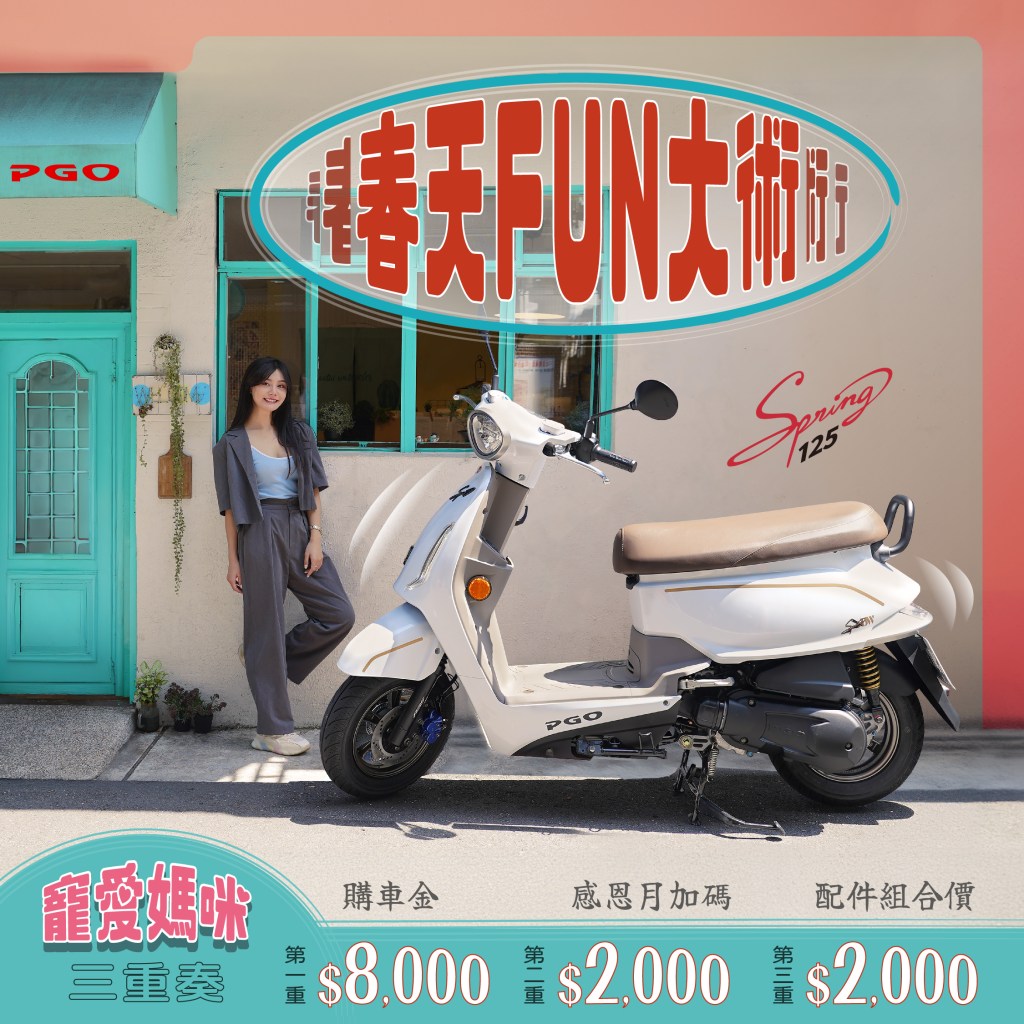 Spring125「春天FUN大術,寵愛媽咪三重奏」,第一重:原廠購車金8,000元;第二重:感恩月加碼2,000元;第三重:精品配件置物籃加保護架組合甜甜價2,000元(工資另計),另有多元分期輕鬆付方案,這波超值優惠必須把握!