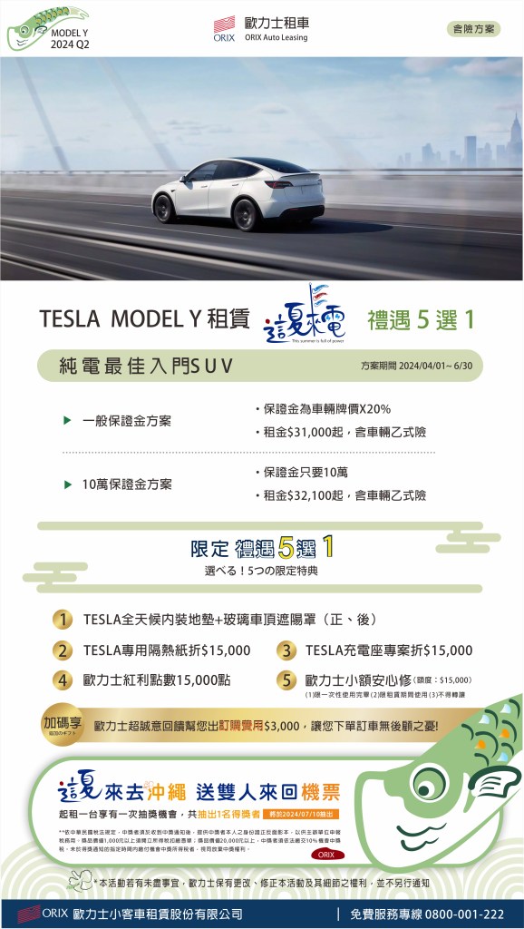 5月報稅季又來臨,租賃車是企業節稅省錢的最佳方式,個人使用租賃車則可享有隱私以及保費較優惠等好處,歐力士租車本季推出【這夏來電】TESLA租賃超優質方案,TESLA全車系終於到齊!全新改版的Model 3煥新版終於在台開始交車,除了外型變得更有辨識度之外,入門車型170萬有找;還有甫降價的Model Y,租金也來到新低點!本期禮遇五選一全新推出「小額安心修」服務,愛車小小碰撞免煩惱,折抵維修費超實用,本期起租再抽沖繩雙人來回機票,讓你飛去海島過夏天!