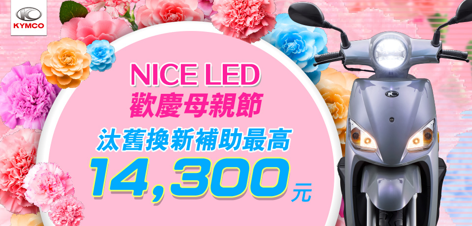 Nice LED擁有僅95kg的輕巧車身、730mm同級最低座高、61.6 km/L 一級油耗與6.6L 超大油箱、320cm 超大腳踏空間,更搭載同級唯一LED頭燈,同級中「最輕、最好載、最省油」,讓媽媽每一次採購都方便、每一次夜晚騎行都安全。LIKE 車系則是擁有時尚優雅的外型,125/150級距提供不同動力需求,自動彈升座墊跟USB充電座則是展現KYMCO對消費者的貼心與用心;Keyless版更是讓媽咪們能夠輕鬆掌控,無論任何場景,都能優雅出行。