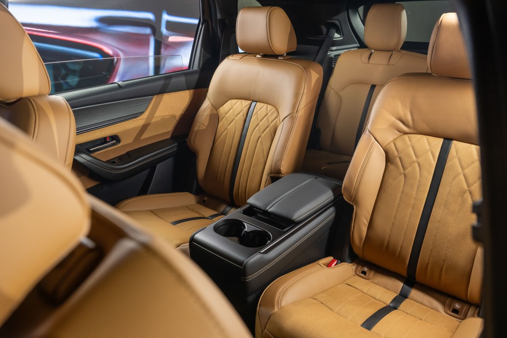 為提供層峰顧客更尊榮的用車禮遇,旗艦六人座 33T AWD Premium Captain Seat 車型不僅於雙前座與第二排獨立雙座旗艦座椅配有導流式通風功能,結合第二排中央多功能控制台更打造舒適愜意的私人移動空間。同時,車艙採用大量柔軟麂皮質感絨料,輔以高貴的暖沙棕配色、棕黑雙色真皮包覆方向盤與暖沙棕菱格紋 Nappa 真皮座椅,營造出豪華且兼具細膩質感的座艙氛圍。