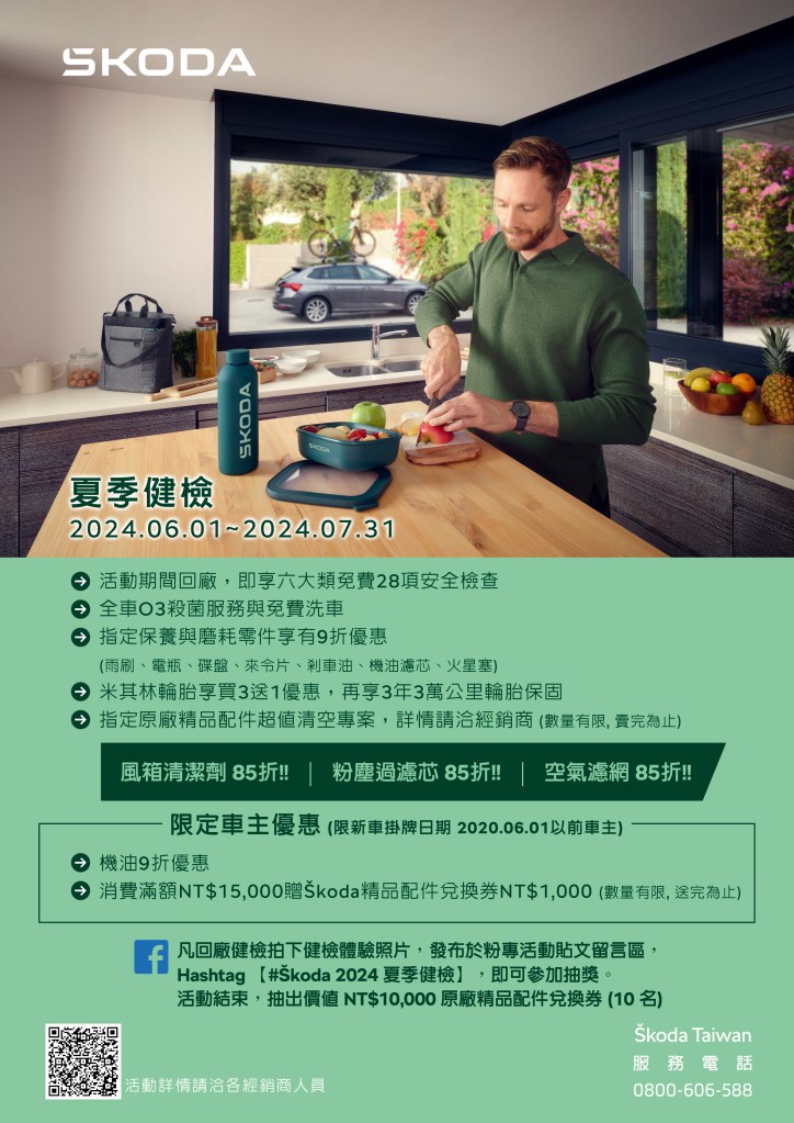 此外,本次夏季健檢針對指定原廠精品配件超值清空專案,詳情請洽經銷商 (數量有限,賣完為止)。而為了鼓勵車主回廠參與Škoda 夏季健檢活動, Škoda Taiwan更提供價值新台幣10,000元的原廠精品配件兌換券做為抽獎贈品,共計10個名額,只要拍下夏季健檢體驗照片發布於粉專活動貼文留言區,即可參加抽獎,中獎名單將於 8月15日 在Škoda Taiwan官方粉絲專頁公布,Škoda Taiwan誠摯的邀請您多多留言於FB (https://www.facebook.com/SkodaTaiwan) 粉專活動貼文留言區並Hashtag「#Škoda 2024 夏季健檢」讓我們根據您的留言持續進步來提供更完善的服務給您,欲了解更多夏季健檢活動資訊,請洽全台各經銷商服務人員。