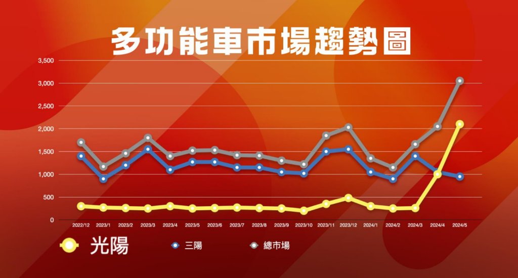 向來商用味頗為濃厚的多功能車,隨著更多人投入外送領域而跟著增加,同時消費者購車也不再限於國民機車或者性能導向的機種,反倒是機能性和乘坐置物空間更多元的多功能車受到青睞,因此從2019年的1.3%佔有率攀升到目前的3.03%,放眼原本由SYM 4MICA獨霸的領域也在2024年3月KYMCO Dollar加入戰局後起了變化,總市場從每月不到2,000輛的規模成長到超過3,000輛,尤其四月兩者更進入死亡交叉,五月份KYMCO Dollar以超過2,000輛的銷售量一舉超越SYM 4MICA,翻轉局勢達成7:3的比例,並成為同級銷售的銷售冠軍。