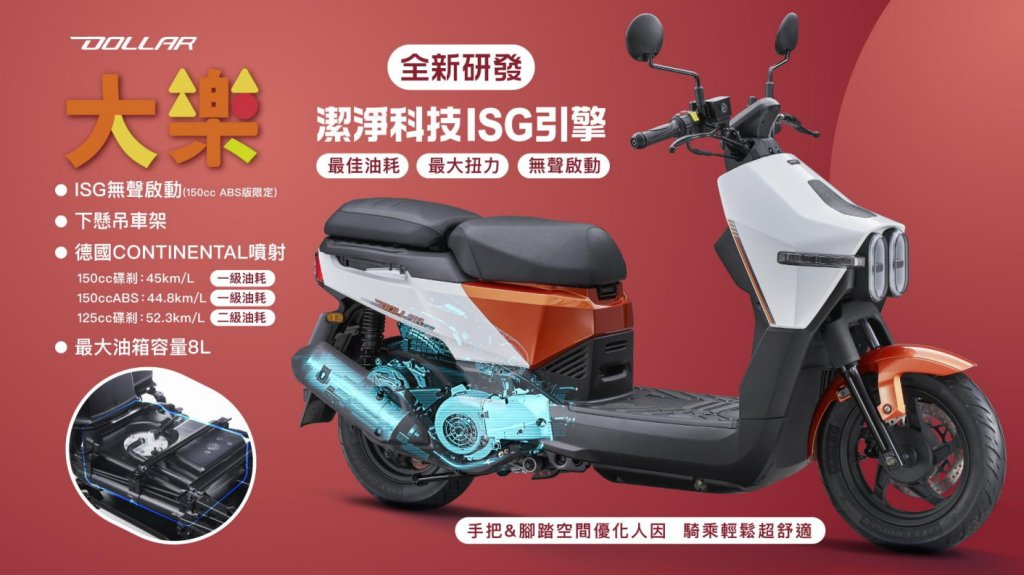 取自英文車名Dollar的諧音,意味能帶來最大的騎駕與生活樂趣,並提供多樣化生活樂趣的多功能FunTech Scooter,車型分為125碟煞、150碟煞、150 ABS+ISG三種的大樂,動力採用全新開發、無聲啟動的潔淨科技ISG引擎,共有125c.c.與150c.c.兩種排氣量,輸出功率分別為10.5ps/1.04kgm、11.6ps/1.31kgm,依排氣量平均油耗分別為52.3km/L、45.0km/L、44.8km/L,搭配高達8公升的油箱,續航里程從358.4-418.4公里不等。同時搭配高強度輕量化車架、雙層鋼管結構腳踏板,與超越同級的3/4安全帽置物箱、Type C快充座、駐車雙閃警示燈、LED雙頭燈、超車燈、引擎斷電熄火開關,讓整體具有最優質的動力、最扎實的底盤、最高的實用性與安全性。