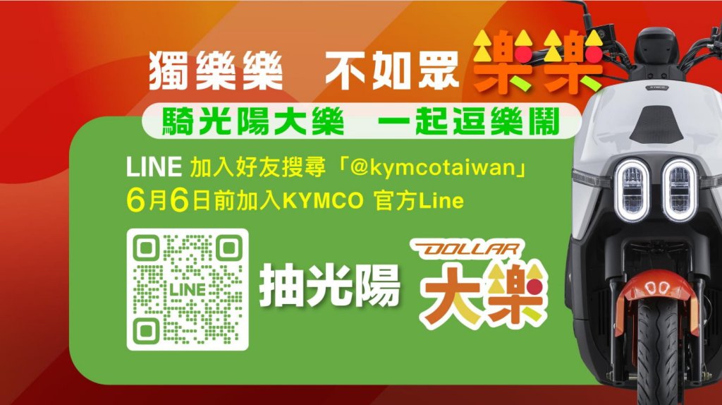 為了延續買氣,KYMCO針對六月份推出購買Dollar加贈6,000元購車金及3,000元中油加油金,和精品8折優惠券,同時若採24期零利率還加贈【神盾保障】。當然好康不僅止於此,基於「獨樂樂 不如眾樂樂」的原則,KYMCO也推出「騎光陽大樂 一起逗樂鬧」活動,只要在LINE加入好友搜尋「@kymcotaiwan」並於6/6前加入KYMCO官方Line,便有機會抽中嶄新的Dollar。