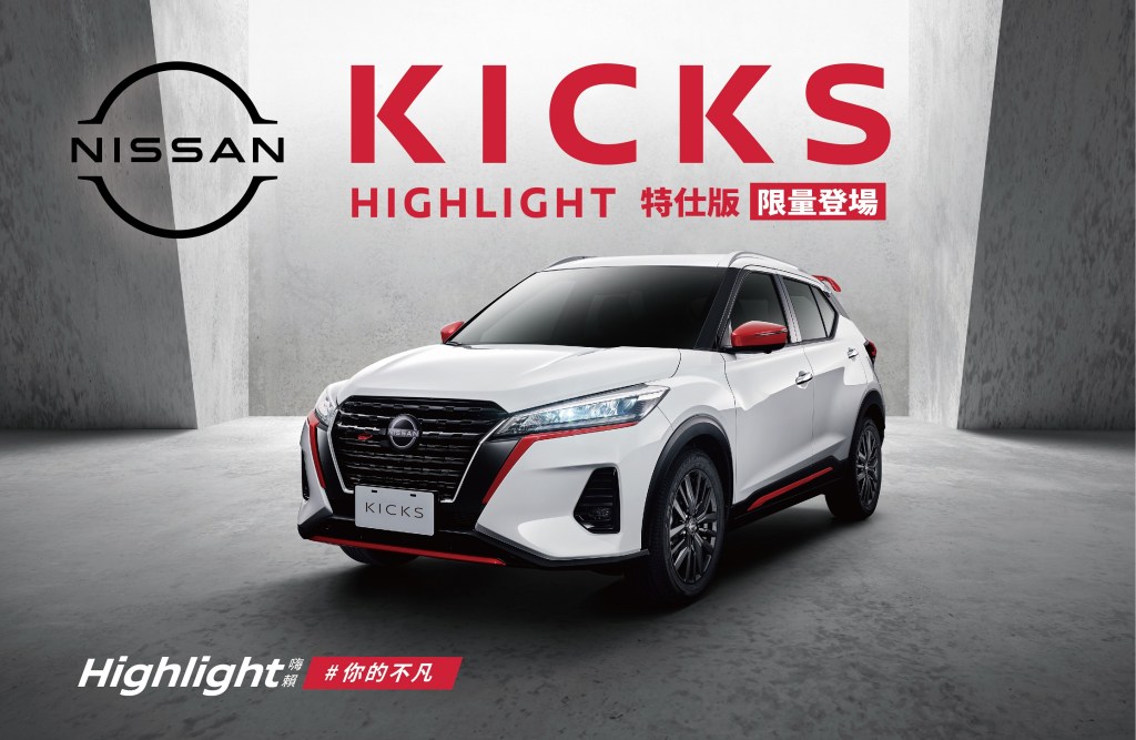 NISSAN為滿足車主彰顯自我風格的需求,限量推出NISSAN KICKS HIGHLIGHT特仕版,運用NISSAN 品牌代表白、黑、紅三原色打造HIGHLIGHT外觀套件含側裙飾條、前車燈、後視鏡、前保桿下飾板及擾流尾翼再搭配17吋黑化鋁圈,營造獨特前衛外型。除外更搭載潮流內裝套件,以紅綴質感設計組成潮流舒適座艙,再配備KICKS字樣頭枕及黑灰雙色專屬皮革座椅,加乘雙色品味。NISSAN KICKS更全面標配NIM智行科技安全配備(註8)與同級最佳動力表現。運用超值產品力,實踐「我開KICKS我驕傲」的顧客好評。