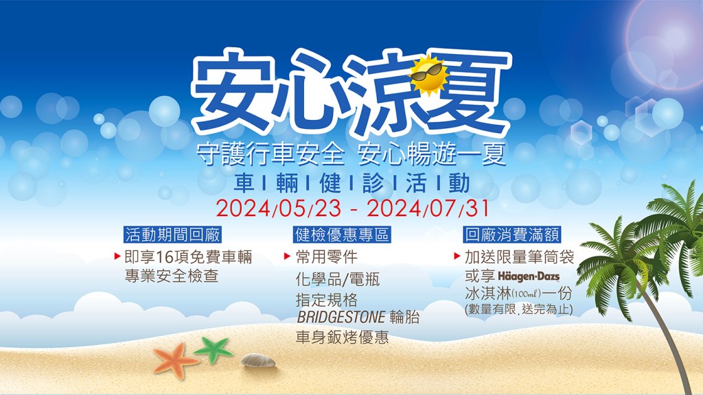 | 1 | 16項愛車免費健診服務 | 2024/05/23 至 2024/07/31 |