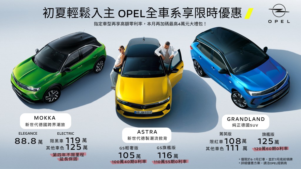 - OPEL全車系限時優惠,只要在 7/31前入主指定車款,即享超低頭期款、高額0利率,本月再加碼最高價值4萬元大禮包,讓您輕鬆入主無負擔。